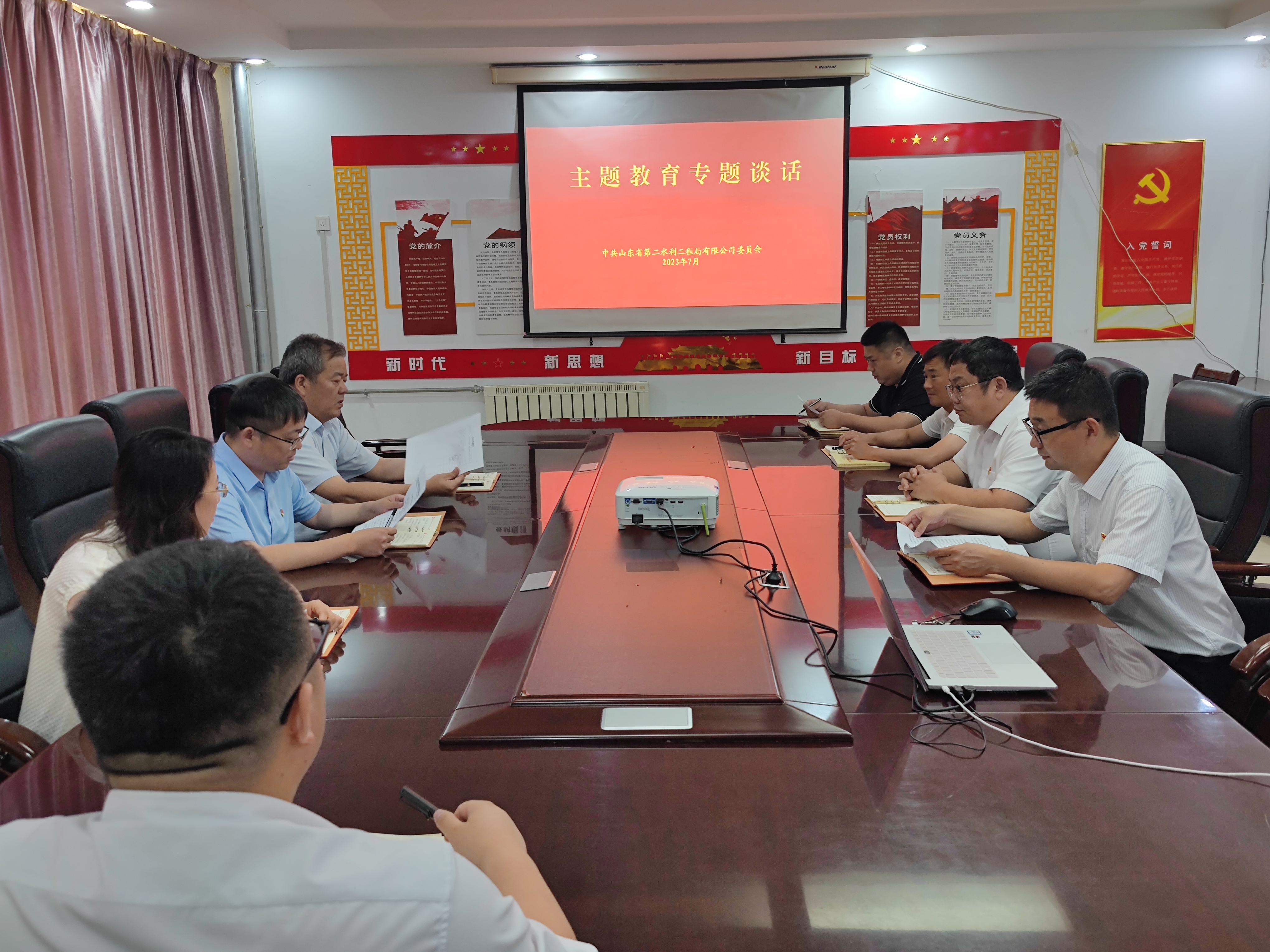 7月7日,二局有限公司党委书记、总经理王传波与领导班子成员、各党支部书记开展主题教育专题谈话。