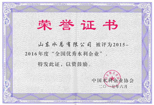 公司荣获2015-2016年度“全国优秀水利企业”